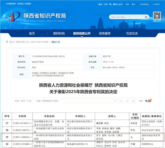 On November 6th, the Shaanxi Provincial Intellectual Property Office officially announced the results of the 2025 Shaanxi Provincial Patent Award selection. The invention patent "A New Type of Rotating Furnace Scraper Baffle Layout Structure" (patent number ZL202111586263.1), applied by Xianyang Keyuan New Material Equipment Co., Ltd., won the Excellence Award!